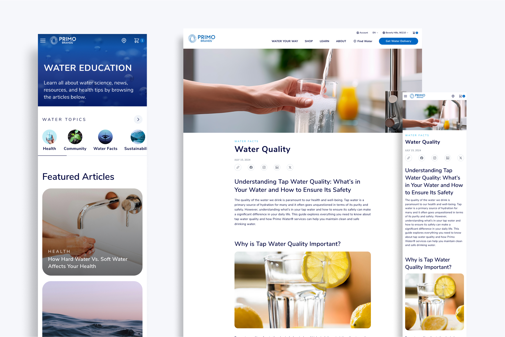 Elevate Digital selected Storyblok’s headless CMS as the backbone of Primo Water’s new platform. We built a scalable, custom block library tailored to Water.com, allowing the team to quickly mix and match components for new pages or updating existing ones—driving speed while maintaining brand consistency. The result was a modular design system paired with a visual editing experience that marketers could immediately adopt. To secure long-term success, we also embedded governance, documentation, and hands-on training so teams felt confident and empowered from day one. The platform’s architecture was purposefully aligned with campaign agility, reducing reliance on developers and ensuring marketing could move at the pace of demand.